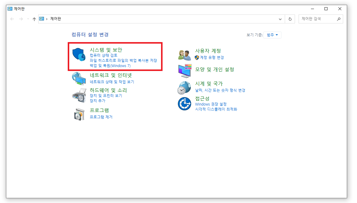 ▲ 제어판창이 열리면 [시스템 및 보안]을 클릭합니다.