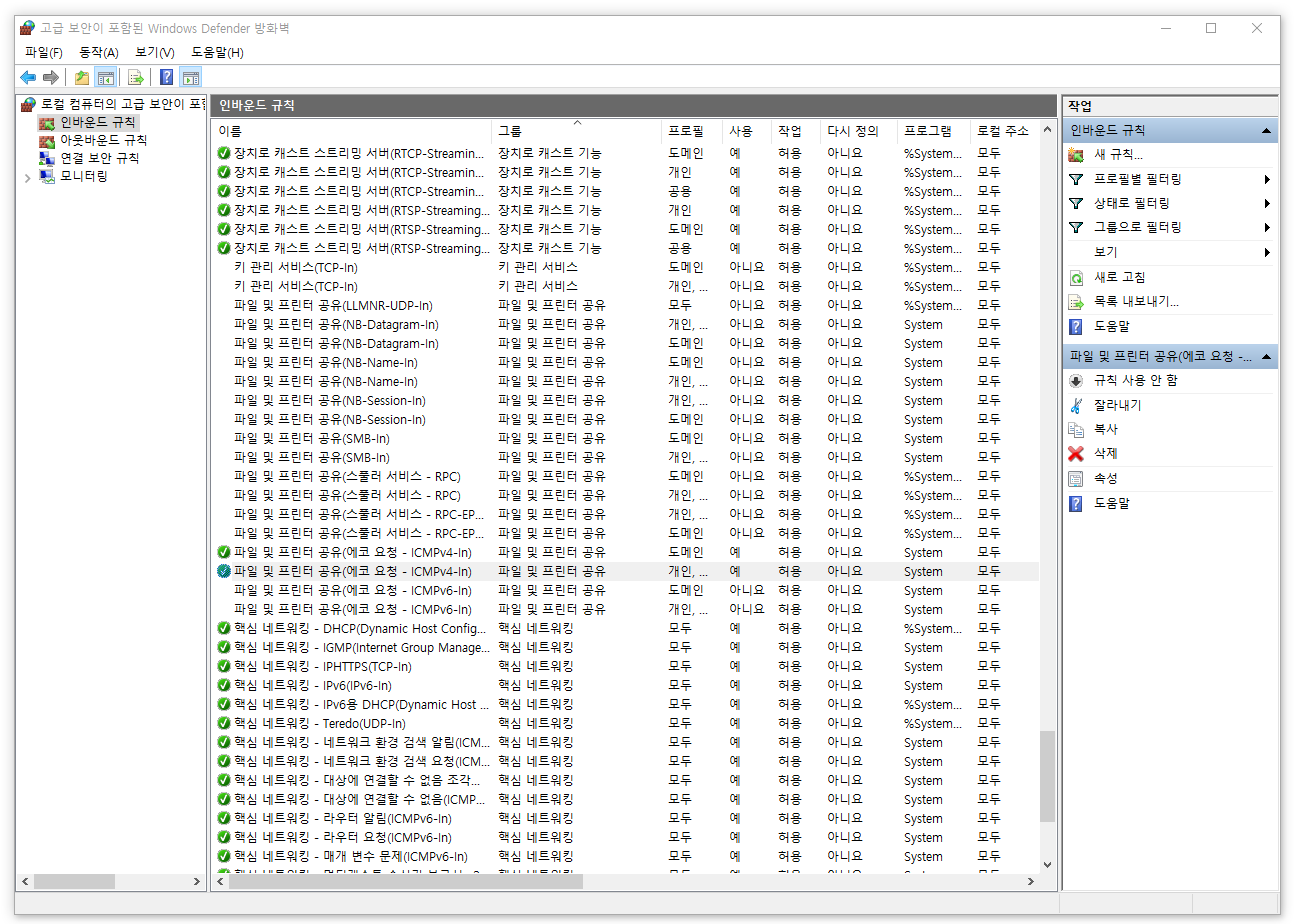 여기서 [파일 및 프린터 공유(에코 요청 - ICMPv4-In)] 항목을 [마우스 우 클릭 - 관리 사용]을 클릭합니다.
