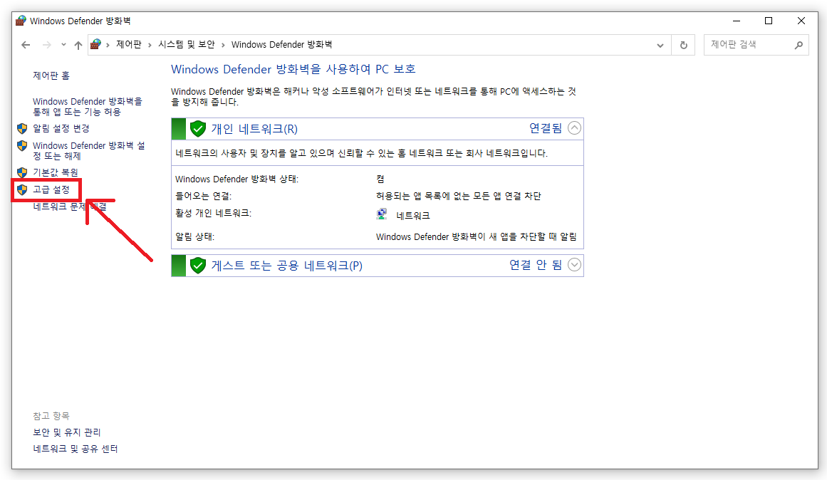 ▲ Windows Defender 방화벽 좌측 메뉴에 있는 [고급 설정]을 클릭합니다.