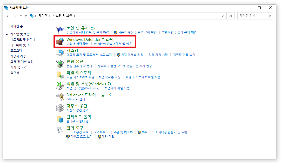 ▲ 시스템 및 보안탭으로 이동 후 [Windows Defender 방화벽]을 클릭합니다.