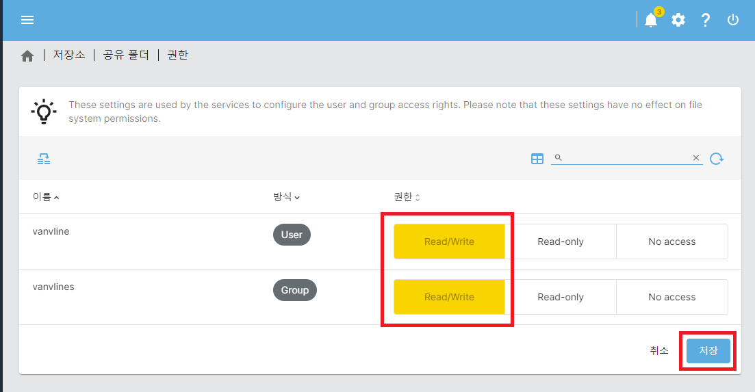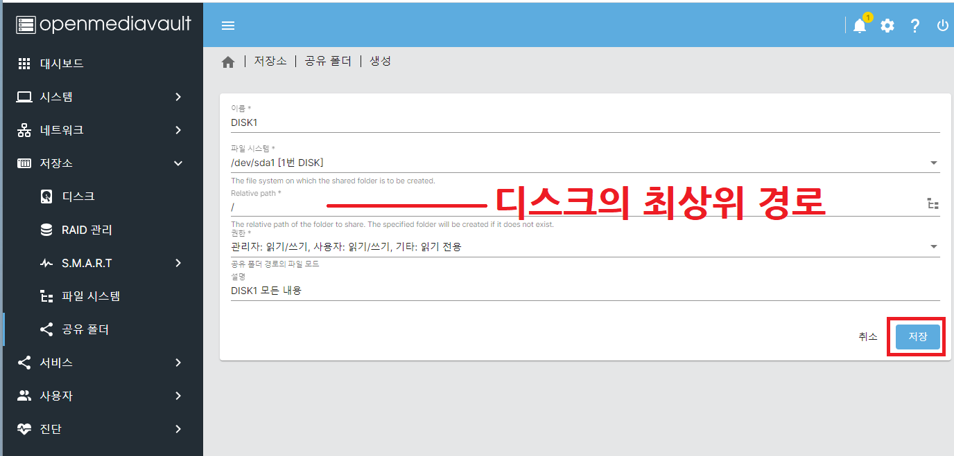 ▲ 공유 폴더로 사용할 디스크를 선택 후 디스크에 있는 모든 내용을 사용하기 위해 경로는 디스크 최상위 경로인 [/]을 입력 후 [저장]을 클릭합니다.