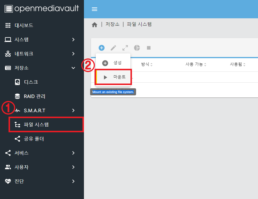 ▲ 이제 디스크 마운트를 위해 [저장소 - 파일 시스템 - + - 마운트]를 클릭합니다.