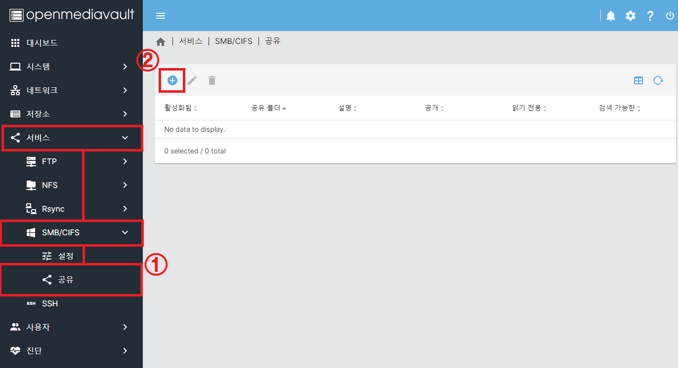 ▲ 이제 SMB 설정을 위해 [서비스 - SMB/CIFS - 공유 - +]를 클릭합니다.