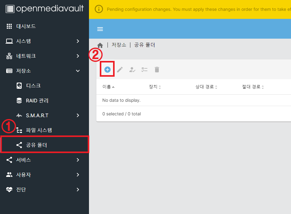 ▲ 이제 마운트한 디스크의 공유 폴더를 설정하기 위해서 [저장소 - 공유 폴더 - +]를 클릭합니다.