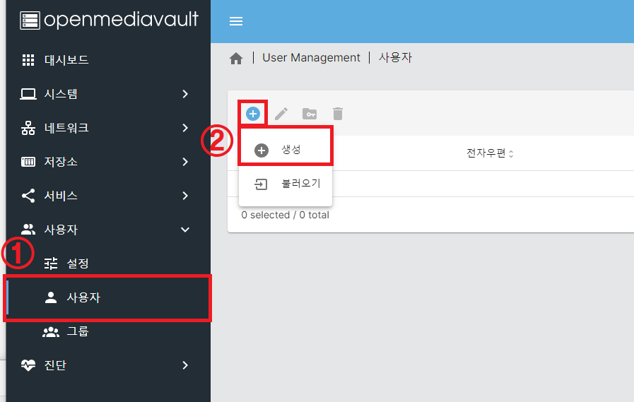 ▲ 우선 접근 사용자를 생성하기 위해 openmediavault 페이지에서 [사용자 - + - 생성]을 클릭합니다.