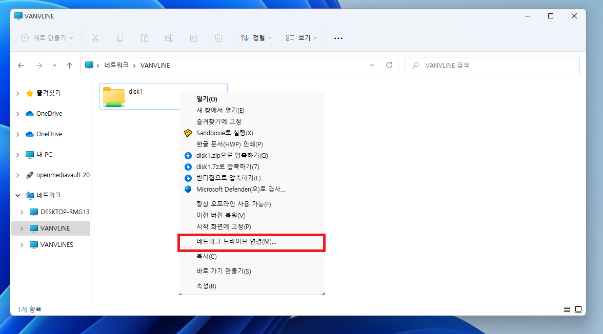 ▲ 위 공유 폴더를 내 PC에 드라이브로 연결하기 위해 [마우스 우 클릭 - 네트워크 드라이브 연결]을 클릭합니다.