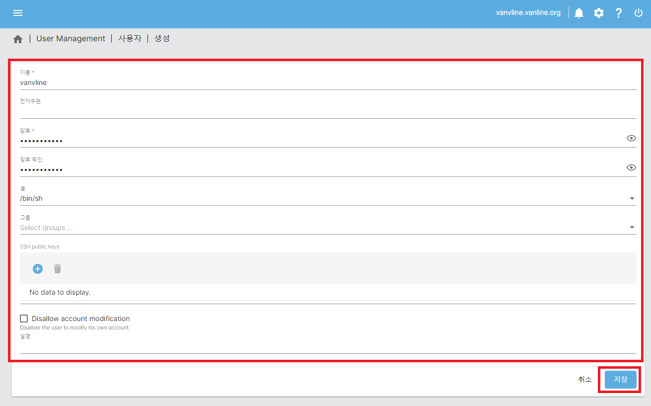 ▲ 생성할 사용자 계정을 입력 후 [저장]을 클릭합니다.