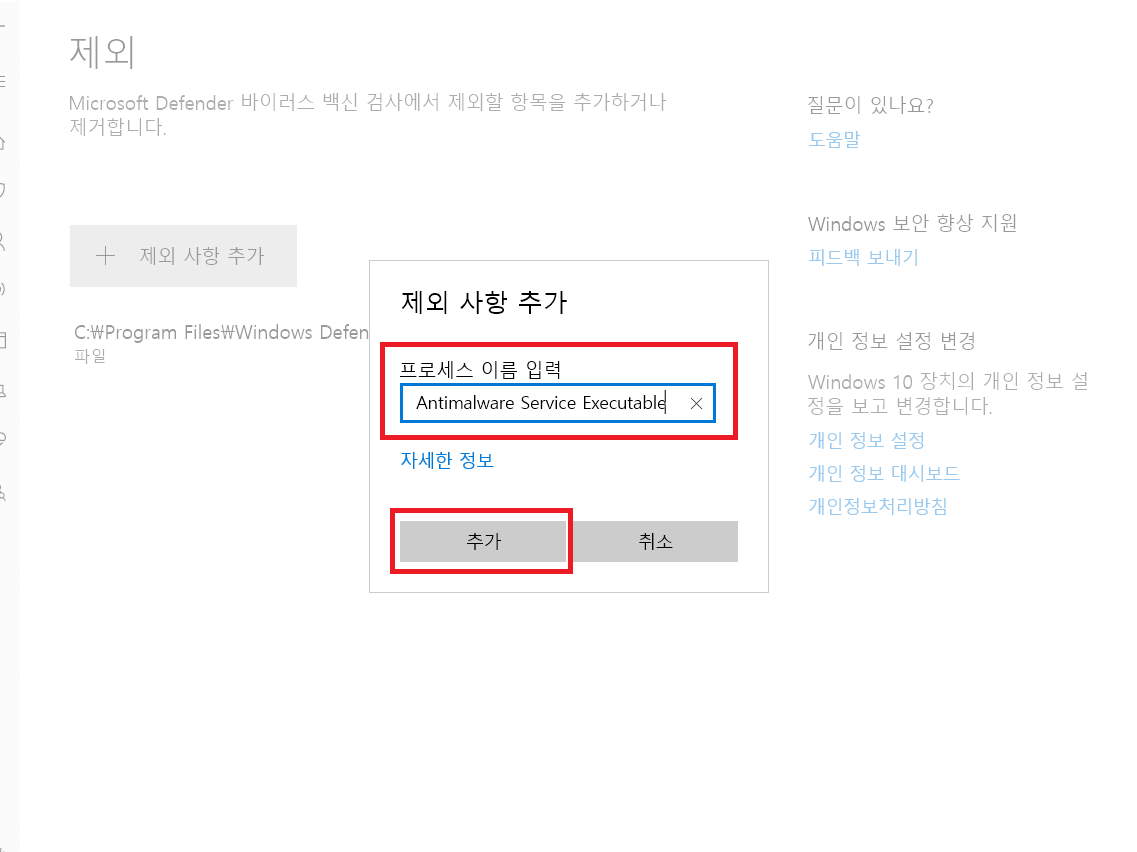▲ 제외 사항 추가창이 열리면, 프로세스 이름 입력 부분에 [Antimalware Service Executable]을 입력 후 [추가]를 해주시면 됩니다.