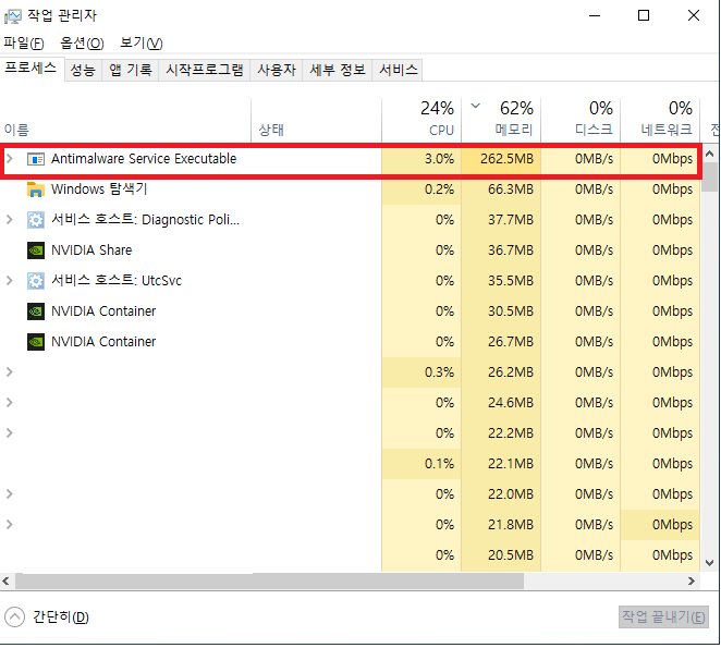 컴퓨터를 사용하다보면 Antimalware Service Executable 프로세스가 메모리 점유율을 많이 사용하는 경우가 있습니다.