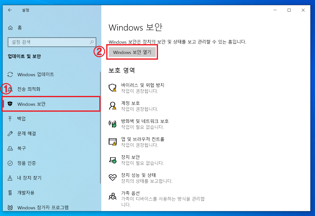 ▲ 업데이트 및 보안 좌측에 있는 [Windows 보안] 메뉴를 클릭 후 [Windows 보안 열기]를 클릭합니다.