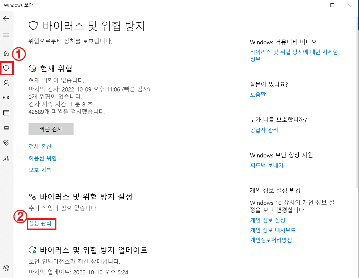 ▲ Windows 보안 창이 열리면, 좌측에 있는 [방패 모양 아이콘]을 클릭 후 바이러스 및 위협 방지 설정 부분에 있는 [설정 관리]를 클릭합니다.