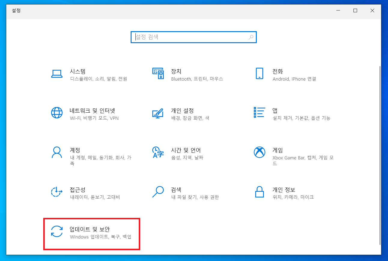 ▲ [윈도우키 + I] 단축키를 사용하여 윈도우 설정창을 열어주신 후 [업데이트 및 보안]을 클릭합니다.