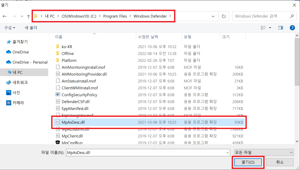 ▲ 열기 창이 열리면, [C:\Program Files\Windows Defender] 경로에 있는 [MpAsDesc.dll] 파일을 선택해줍니다.