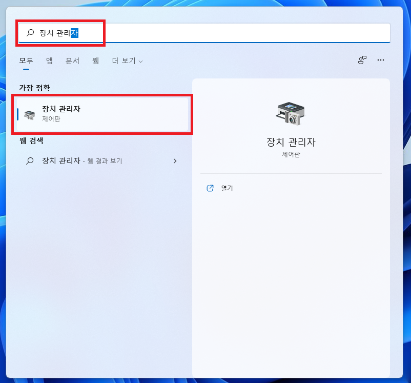 ▲ [윈도우키 + Q] 단축키를 사용하여 "장치 관리자"를 검색 후 클릭합니다.
