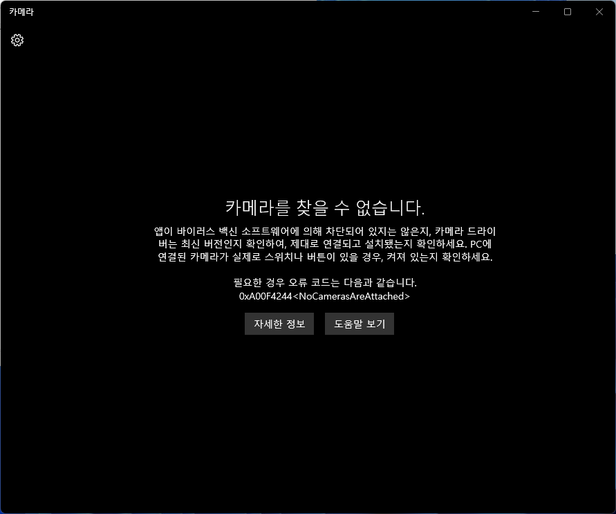 ▲ 노트북 웹캠 차단이 완료되면, 위와 같이 카메라를 사용하는 프로그램을 사용하면 위와 같이 카메라를 찾을 수 없다는 메세지가 나타나며, 노트북 웹캠이 차단됩니다.