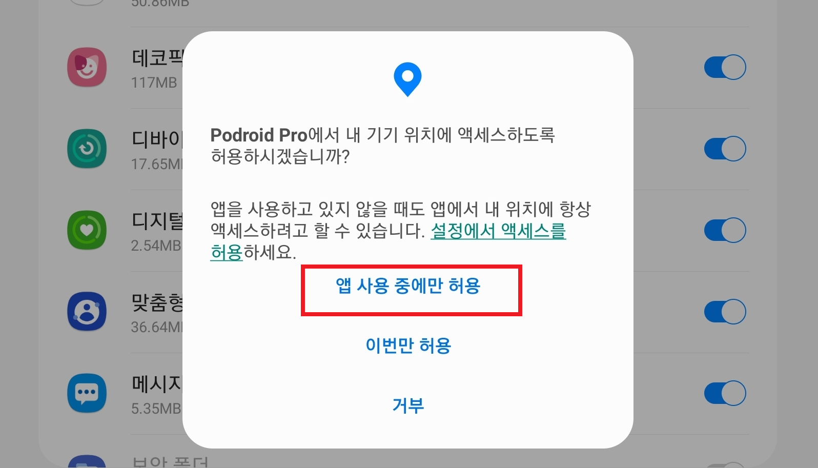 ▲ 그 후 위치 액세스 및 다른 앱 위에 표시 부분도 활성화 해주시면 됩니다.