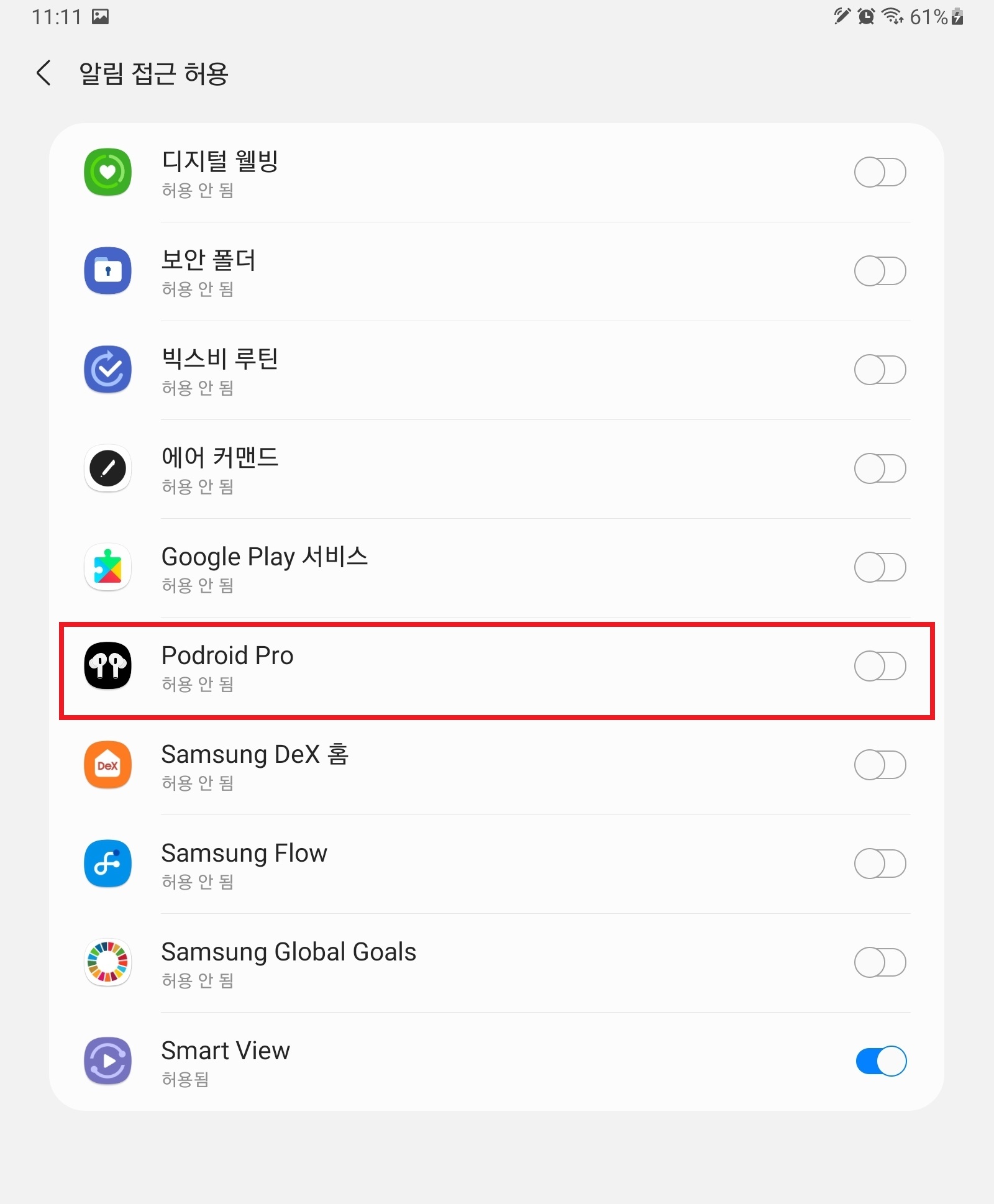 ▲ Podrid Pro 앱 설치 후 실행하면 Podrid Pro 앱에 대한 알림 접근 허용을 활성화 해줍니다.